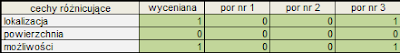W dalszej kolejności autor przypisał konkretne cechy nieruchomości wycenianej i nieruchomościom porównawczym. Wyglądało to jak w tabelce poniżej.