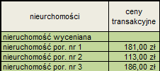 Ano autor w operacie szacunkowym opisał rynek nieruchomości prezentując zeń trzy (słownie: trzy) transakcje. OK. Może tyle tylko było. Przyjęte do porównań transakcje wyglądały tak: porównawcza 1 – 181,00 zł/mkw, porównawcza 2 – 113,00 zł/mkw i porównawcza 3 186,00 zł/mkw.